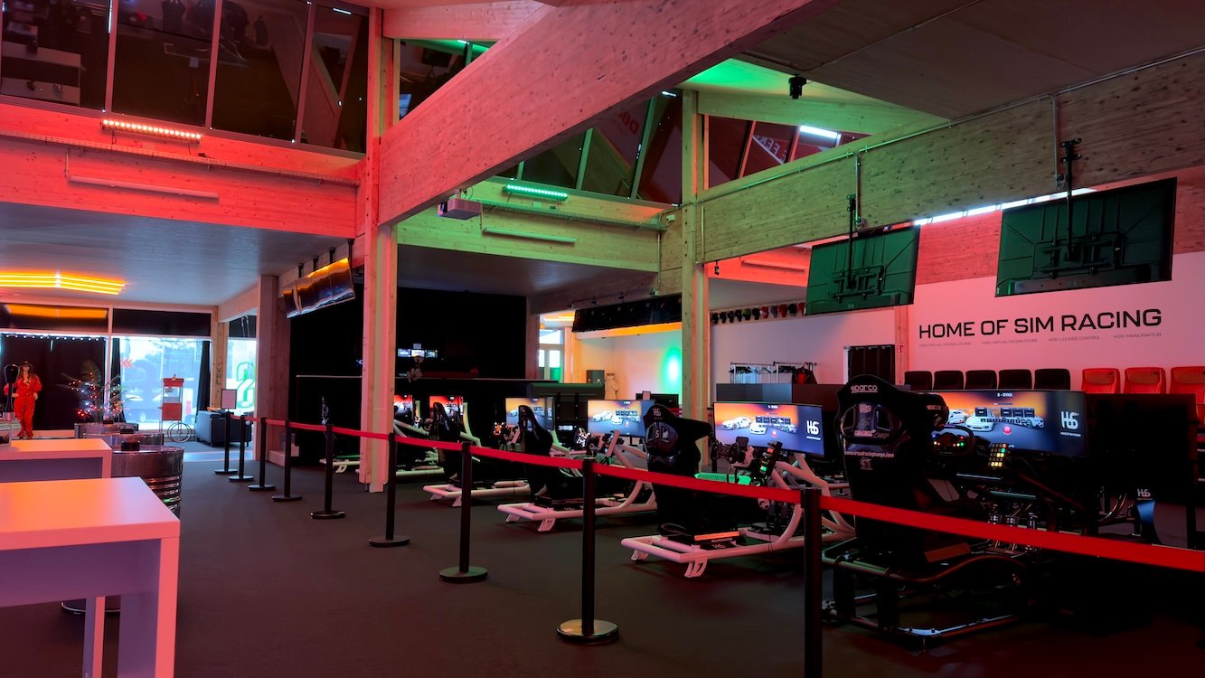 In our “Arena” with real cinema seats, you can comfortably follow the race action, race broadcasts, and timing tables. The slightly elevated seating position offers the best overview of all simulators.